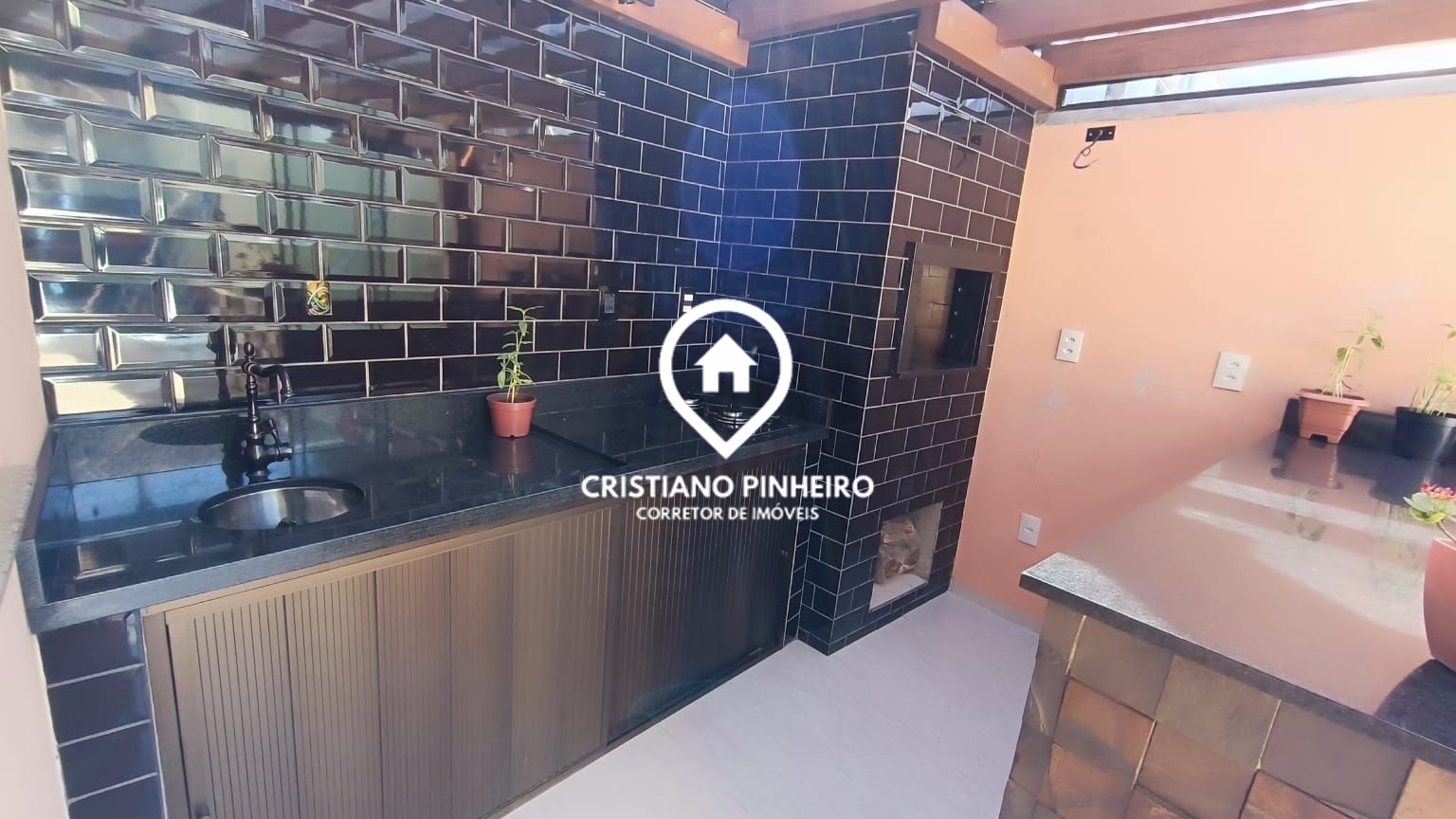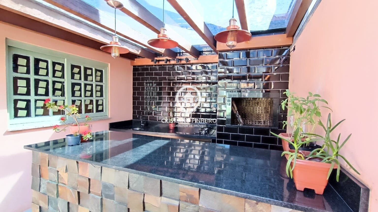 Linda área gourmet em pergolado de madeira nobre com teto de vidro com película, piso em porcelanato e bancadas de granito, equipada com churrasqueira, cooktop, pia e armários, fechada com portas de vidro, jardim grande, cobertura para 1 carro mais um espaço para outro descoberto e portão eletrônico.